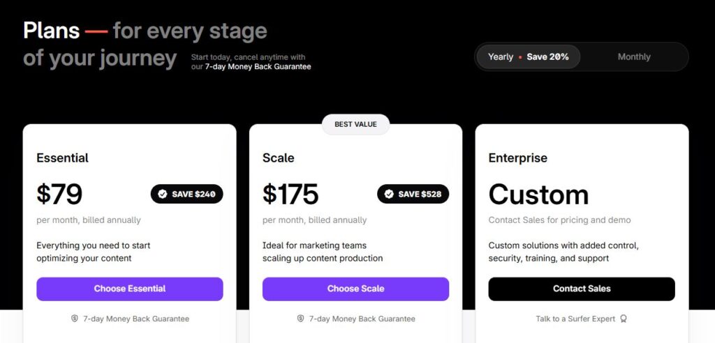 Note: Surfer SEO’s Essential Plan is most popular plan and recommended plan to get 30 content editors per month.